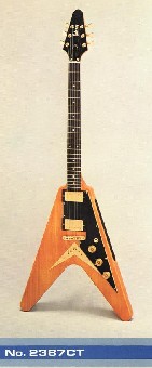 | What we have is a guitar made in 1975. Here are scans from Ibanez catalogs from 1975 and 1976. The two obvious differences between the two guitars are: 1. The pickguard on the 1975 model goes under the bridge like the 1958 Gibson Flying V. 2. The 1975 doesn't have a "no-slip" strip on the lower bout like the 1976 model or the 1958 Gibson Flying V. 3. You can't see it here, but the back of the headstock on the 1975 model was not painted and did not have a serial number, while the 1976 model had a black "widows peak" with a serial number. 4. The bridge on the 1975 model appears to be slimmer than the one on the 1976. |