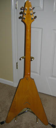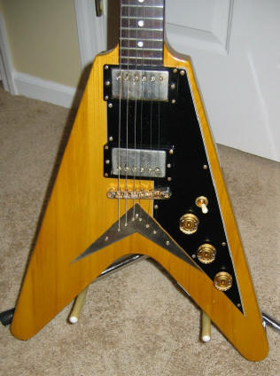 | We finally got the switch replaced, leaving the other electronics in place, and it worked out great. Remember -- these guitars are metric, and Gibson parts are Imperial. So, we got what appears to be an Epiphone three-way switch, and installed it on the guitar. We used the original nut and washer from the Ibanez switch and it fit perfectly. The original switch is in the case now, and it was in pretty bad shape. It didn't look like it had been overplayed or abused, but it looked like something had been poured into it. Aren't house parties wonderful! Once the switch was installed, we completed a fret polish on the guitar and just generally cleaned it up. Safety Tip: Don't try to play this rig sitting down. The position of the jack on the inside of the lower wing and the absence of a rub strip make it nearly impossible. The only alternative is to hang it on a strap, put on some old KISS, and ROCK! Overall, this guitar plays and sounds great. Like we said before, this guitar may have some of the best PAF-clone pickups we've ever heard. This classic was headed for the trash bin, and we saved it. Check out the photos! |