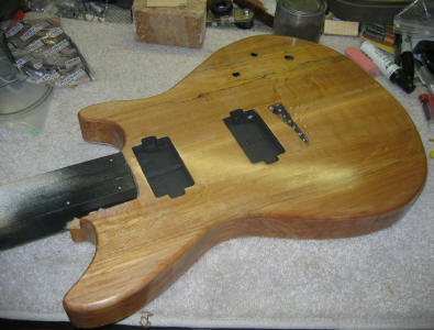A photo of the back of the body. The neck attachment screws have been drilled -- holding the finishing stick -- and the ferrules have been installed. The control cavity is also finished in shielding paint. The cavity is made purposely large to allow for more controls and a preamp, if required. The ferrules are always a challenge! Practice on scrap and use a drill press! | |