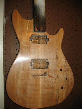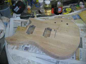 paint the cavities prior to reassembly. The interesting thing about this photo is that the nitro-finished body is shinier before buffing than the water-based finished body was after buffing. I think there is a future in water-based products, but I don't think we are quite there yet for guitars. Note the incredible grain in this alder. The nitro really brought out the curl and the spalt.