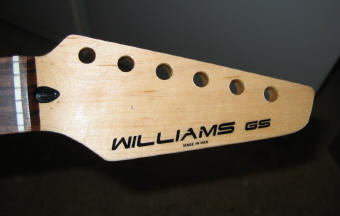 Here is a photo of the resized and refinished headstock. We can't say for sure, but we felt like the original headstock on this guitar was too big. This headstock is generally the shape of our 3+3 headstock, and subsequent necks will have the 3+3 setup. After the cuts we installed a new decal and sprayed with nitro. The neck is curing in the storage room, ready for buffing.
