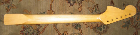 | We wanted a neck with the late 60's big headstock. We bought this from a guy who is a custom builder in Pennsylvania. We'll let you know how it works out. Note this guitar has no "skunk stripe" on the back, and it has all of the appointments we were looking for to make an authentic-looking S-Style. The plan is to get the guitar setup and playing then strip the finish for that authentic look. A Gibson decal is also required. |