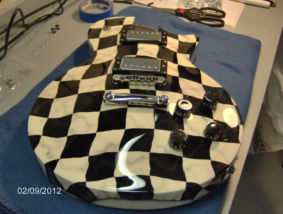 A SAGA LP Saga My name is Greg Gilbert. I recently bought a Saga LP as something to do during the cold Ohio Winter months. It is my first one I have built. Needless to say, I would do a few things different if I were to try and build another one. Anyway, I wanted a Blue burst with the white pickguard. I sanded, and sanded, and sanded some more on the body. I eventually went through the veneer-like layer...the blue looked terrible. Plan two- A checkered flag design.