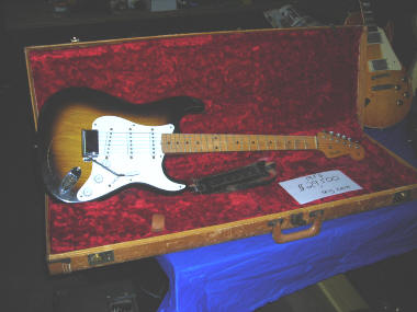 for $29,500...ouch. This was a very, very clean two-color burst Strat. It had the original case candy and the "ashtray" cover for the bridge. |